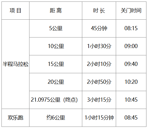 为了保证参赛选手比赛安全、顺利,比赛期间比赛路线各段设关门时间,限时对社会交通封闭。关门时间到后,相应路段恢复社会交通。参赛选手需在规定的关门时间内完赛,未跑完对应的距离须立即停止比赛,退出赛道,以免发生危险。退出比赛的选手可乘坐组委会提供的收容车到相应项目的终点处。