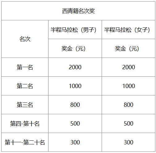 本次比赛特设西青籍个人奖,男、女分别录取前20名(按净计时成绩进行排名),分别获得奖金。