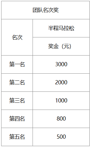 半程马拉松完赛运动员不足5人的团队不计名次(团队赛,个人项目可同时获奖)。